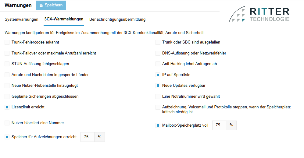 In diesem Fenster sehen Sie nun drei Bereiche, nämlich Systemwarnungen, 3CX-Warnmeldungen und Benachrichtigungsübermittlung.