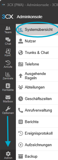 Navigieren Sie zunächst in der 3CX Management-Konsole zu Admin → Systemübersicht